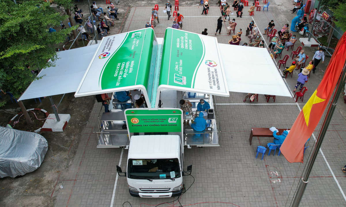 Chiếc xe thiết kế với thùng xe có thể nâng lên, mở rộng ra kèm theo bạt che, tủ đông, hệ thống khử khuẩn tự động... phục vụ tiêm vaccine.